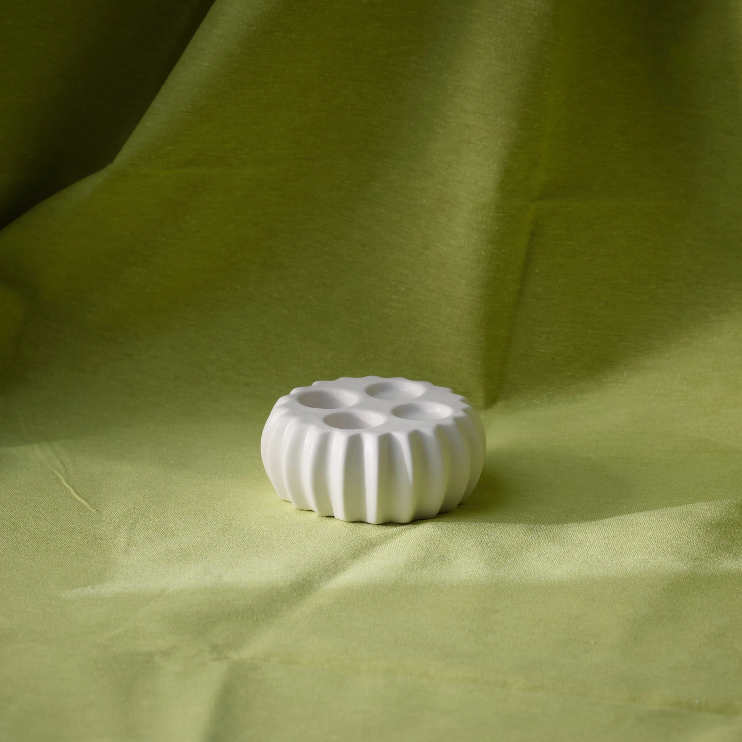 This small porcelain vessel has 2 holes to fill it with either cold or warm water that the tissue will absorb after dipping.